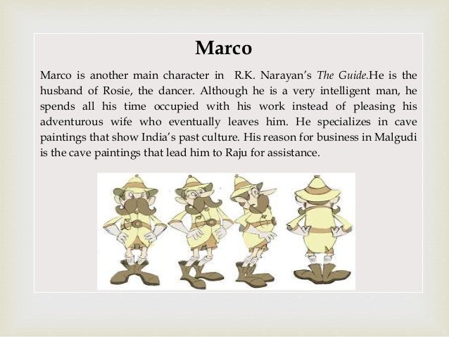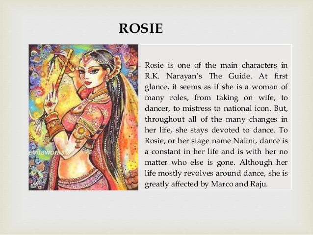 As a tourist guide he is widely popular. It is this profession which brings him in contact with Marco and his beautiful wife, Rosie. While the husband is busy with his archaeological studies, Raju seduces his wife and has a good time with her. Ultimately Marco comes to know of her affair with Raju and goes away to Madras leaving Rosie behind.